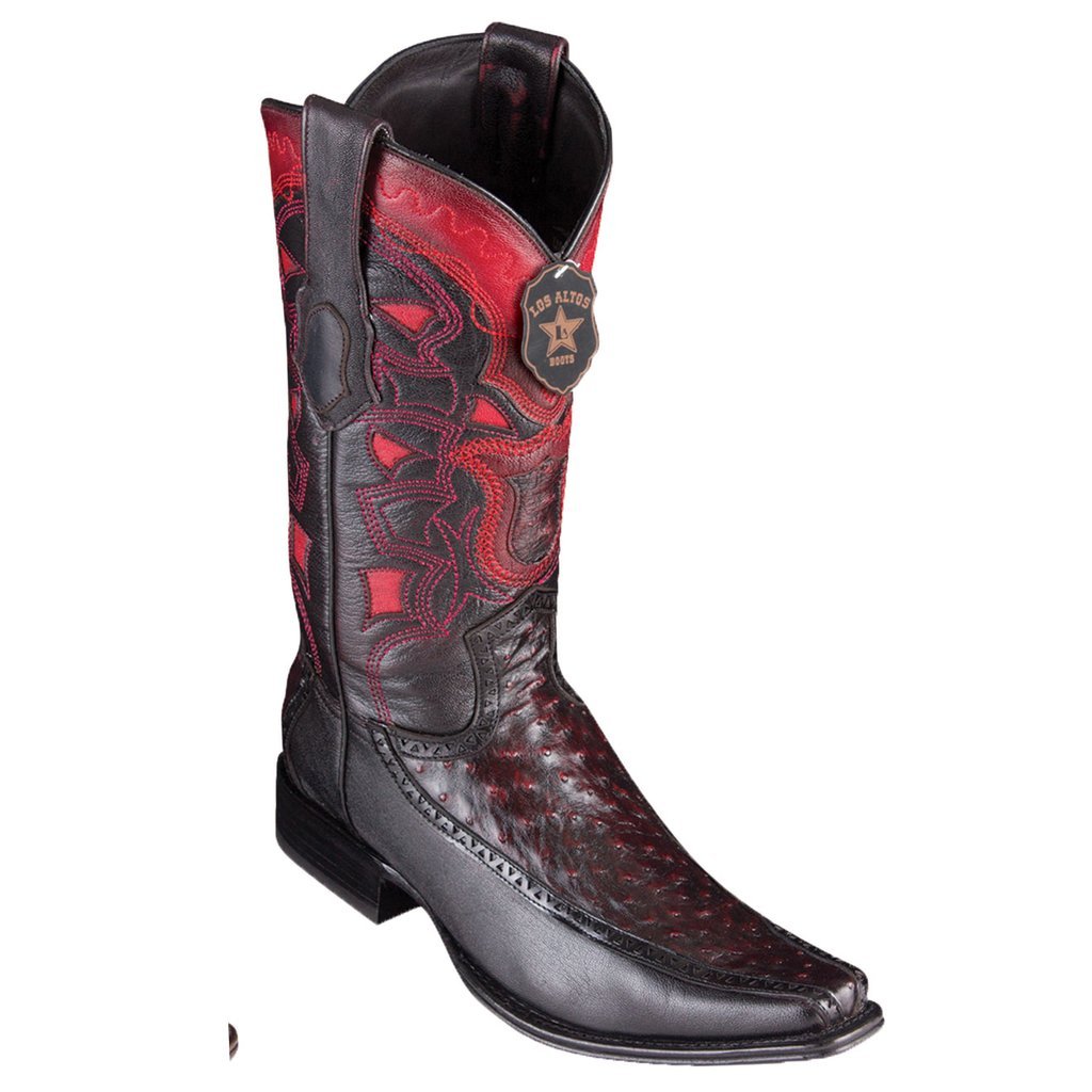 Los Altos Genuine Ostrich Narrow Square Toe Boot with Inlay Trim in Black Cherry